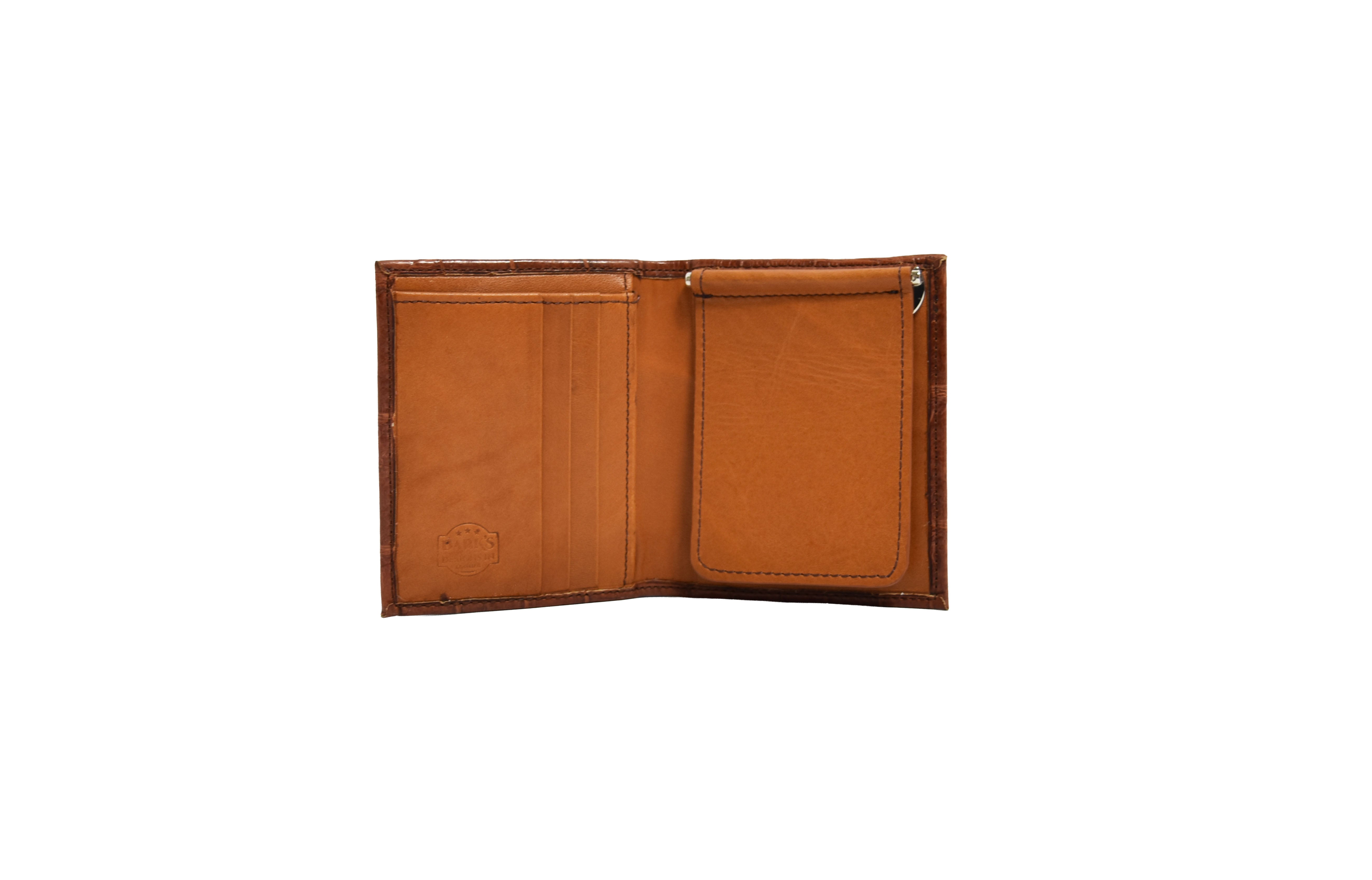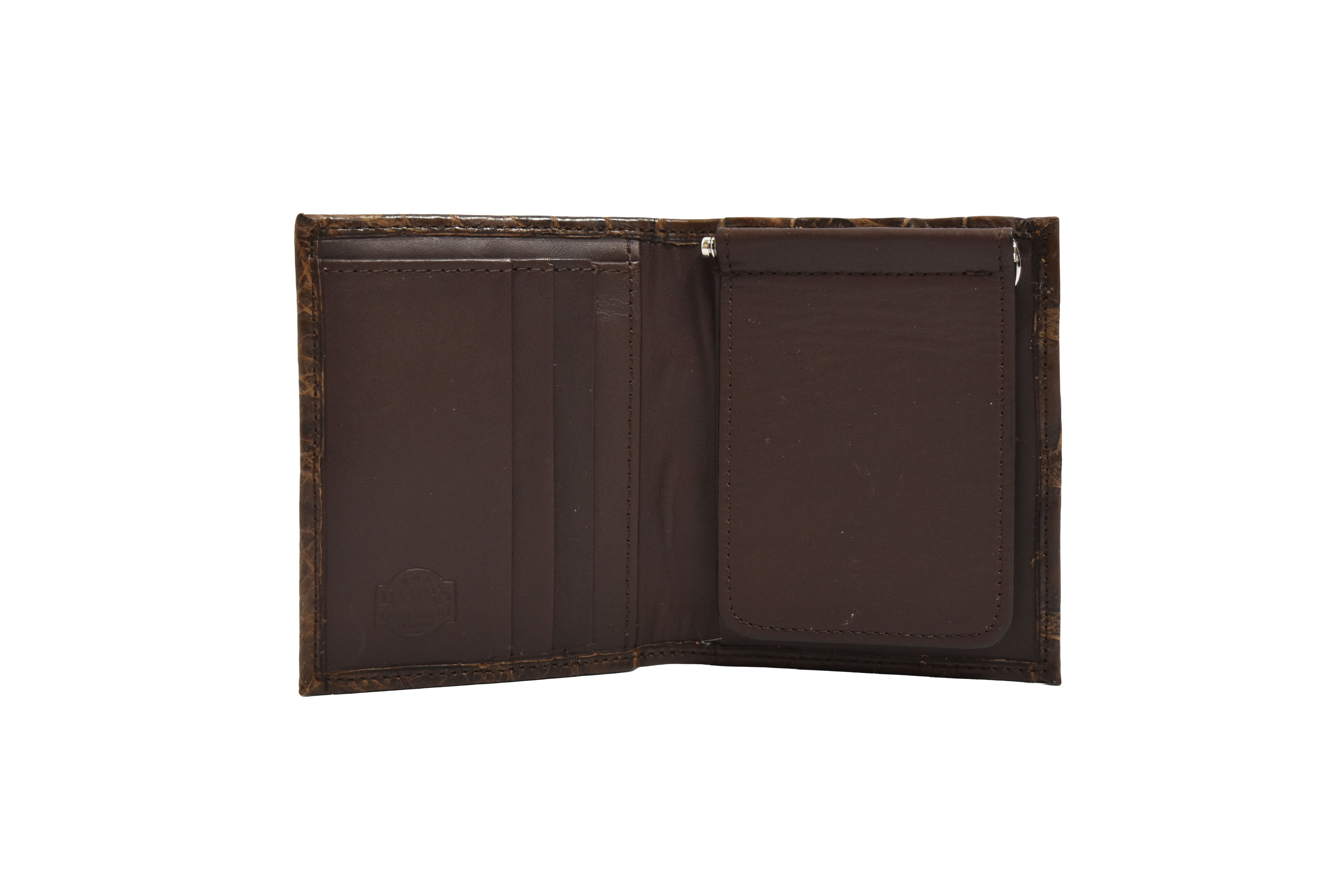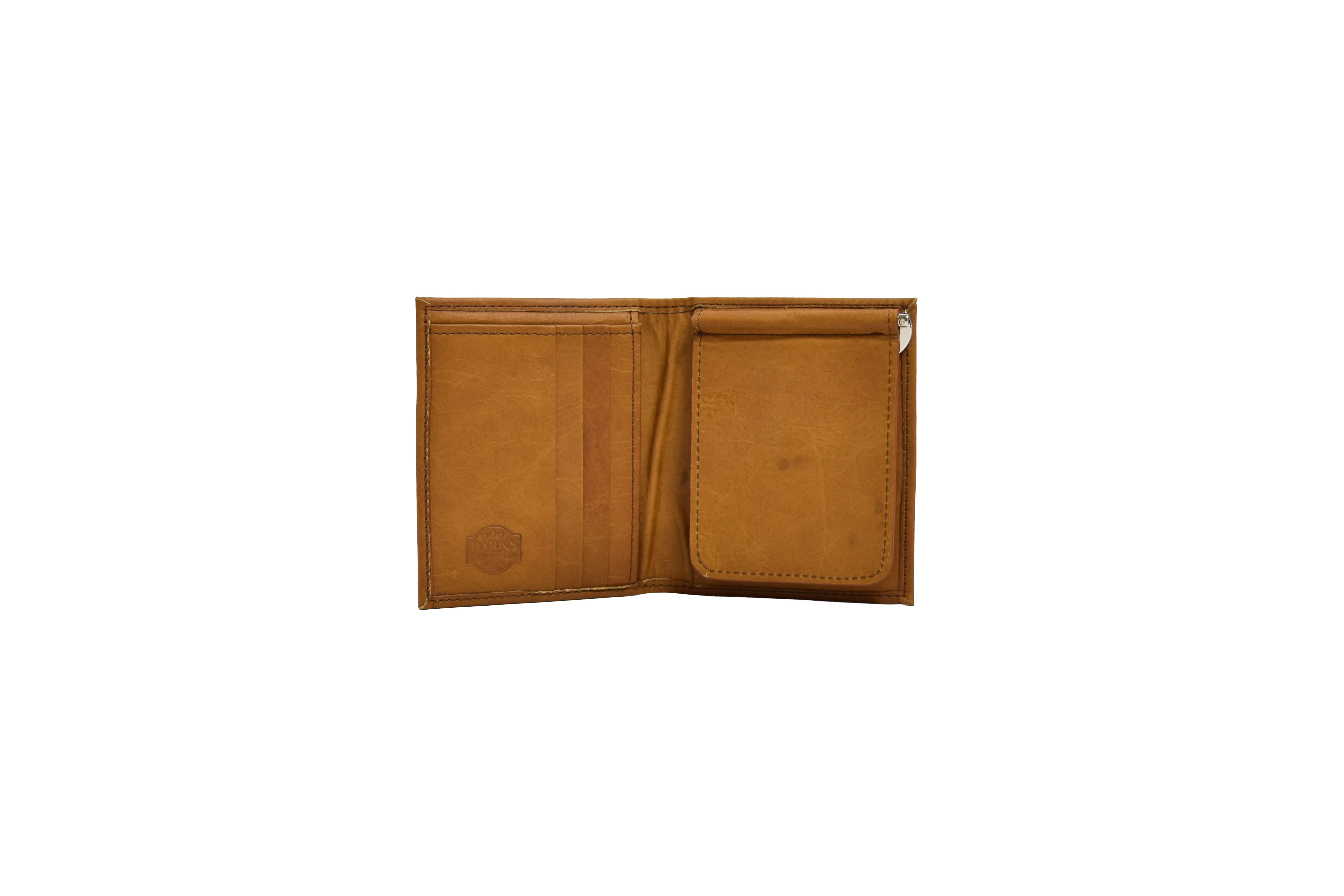 At the center, a spring-loaded brass money clip securely holds your cash in place while adding a classic, rugged touch.